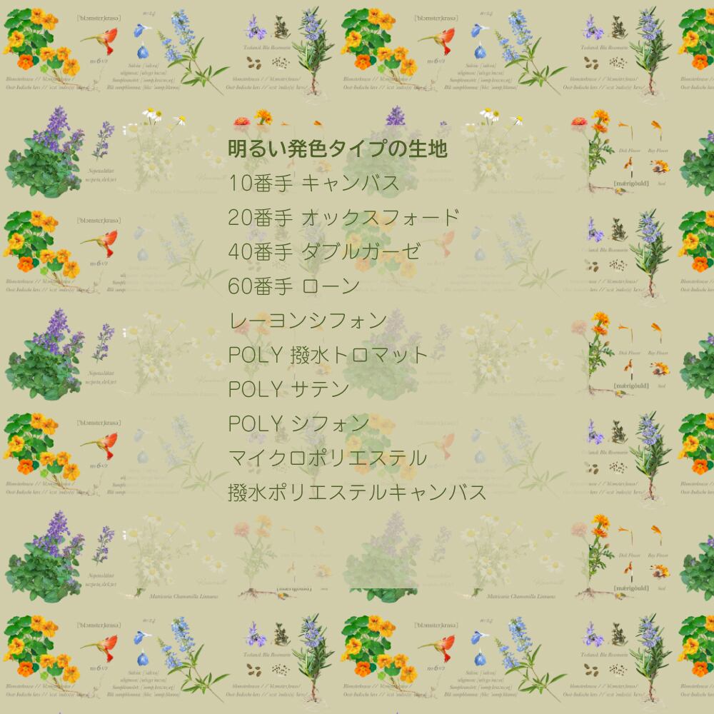 12種類の素材によりそれぞれの生地の特性上発色がことなります。